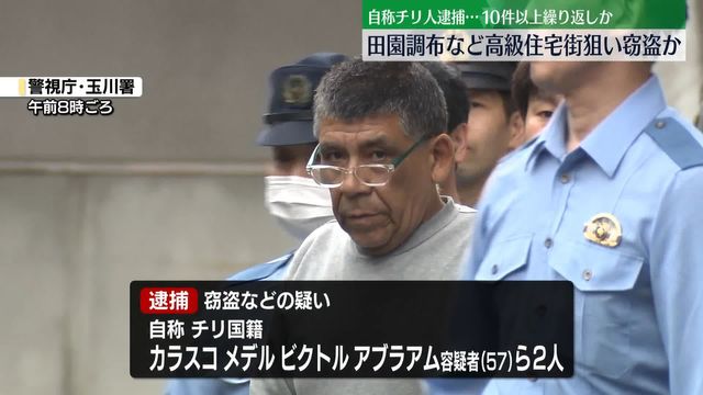 東京・田園調布の住宅から約1670万円相当の金品を盗んだとして、警視庁は16日、チリ国籍の住所・職業不詳、カラスコメデル・ビクトルアブラアム容疑者(57)(いずれも自称)ら男2人を窃盗容疑などで逮捕したと発表した。2人が8月27日に来日し、高級住宅を狙って1都3県で約10件の空き巣を繰り返したとみている。