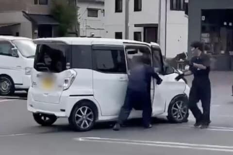 動画はすでに黒い乗用車1台と衝突した直後とみられる場面から始まる。従業員2人が駆けつけ運転席のドアを開けて止めようとするも、車は停止することなく勢いよくバック、白い乗用車に衝突した。従業員の1人が車の後ろに回っていたため、危うく挟まれそうになっていた。